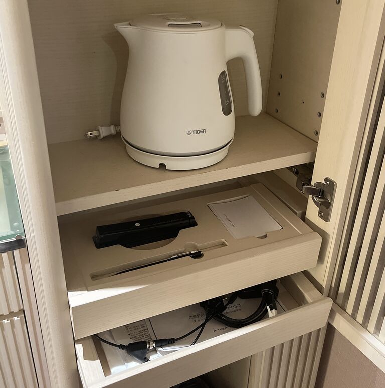 ポットや充電器、カップなど必要なものは揃っています。
