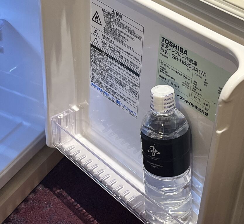 冷蔵庫もそこそこの大きさでお水が一本サービス。