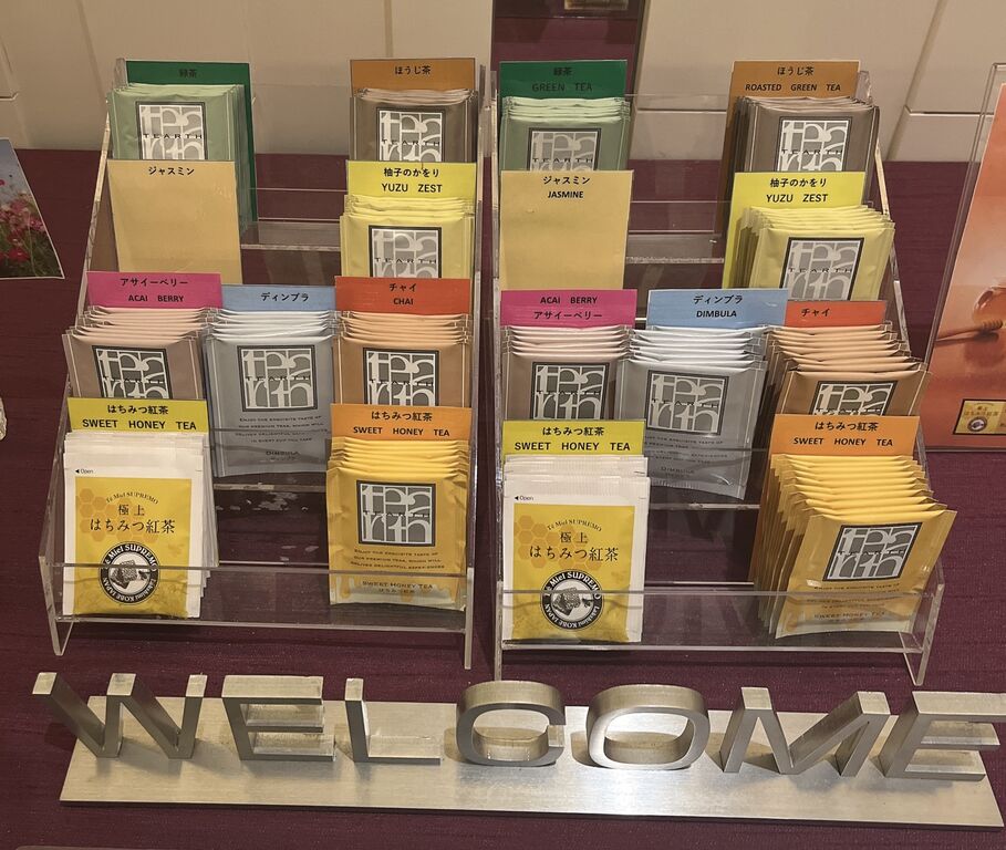 ロビー階には、ハーブティーや日本茶、蜂蜜紅茶など、さまざまな種類のお茶のティーバッグがあり、お部屋で楽しめます。