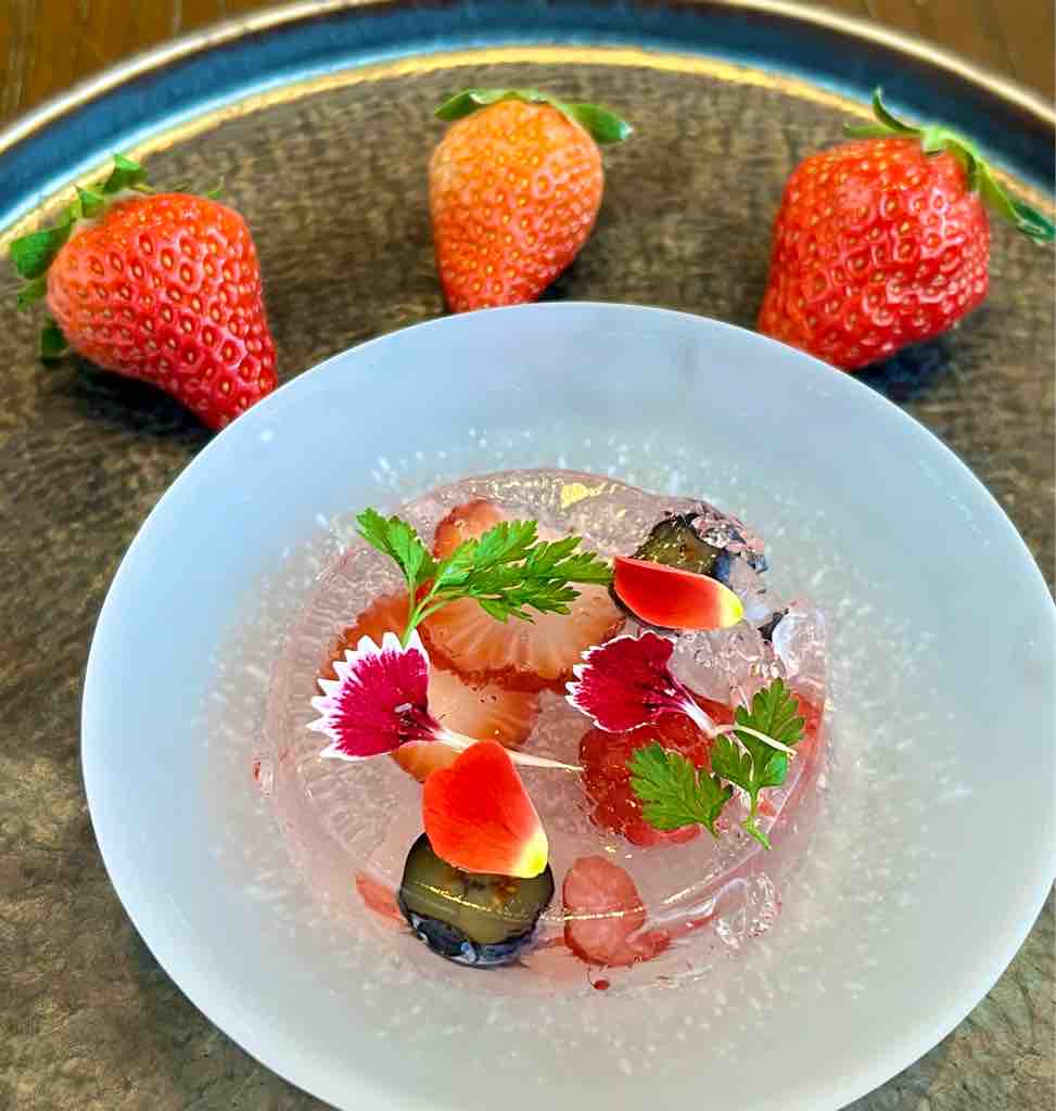 前菜は、いちごとブルーベリーをピンク色のゼリーで固めて花びらや葉っぱを散らした美しい一品「ストロベリーモザイクジェム」。