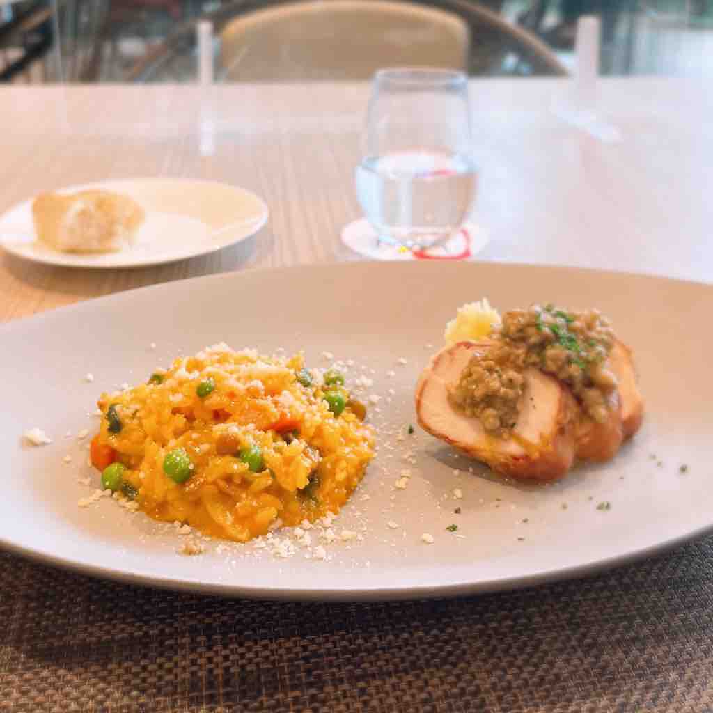 前菜、パン、パスタまたはリゾットとメイン(魚または肉)がワンプレートで提供されます。