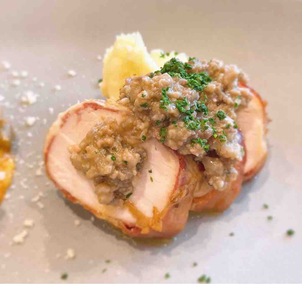 メインはしっとりとした鶏ムネ肉を生ハムで包んだもの。