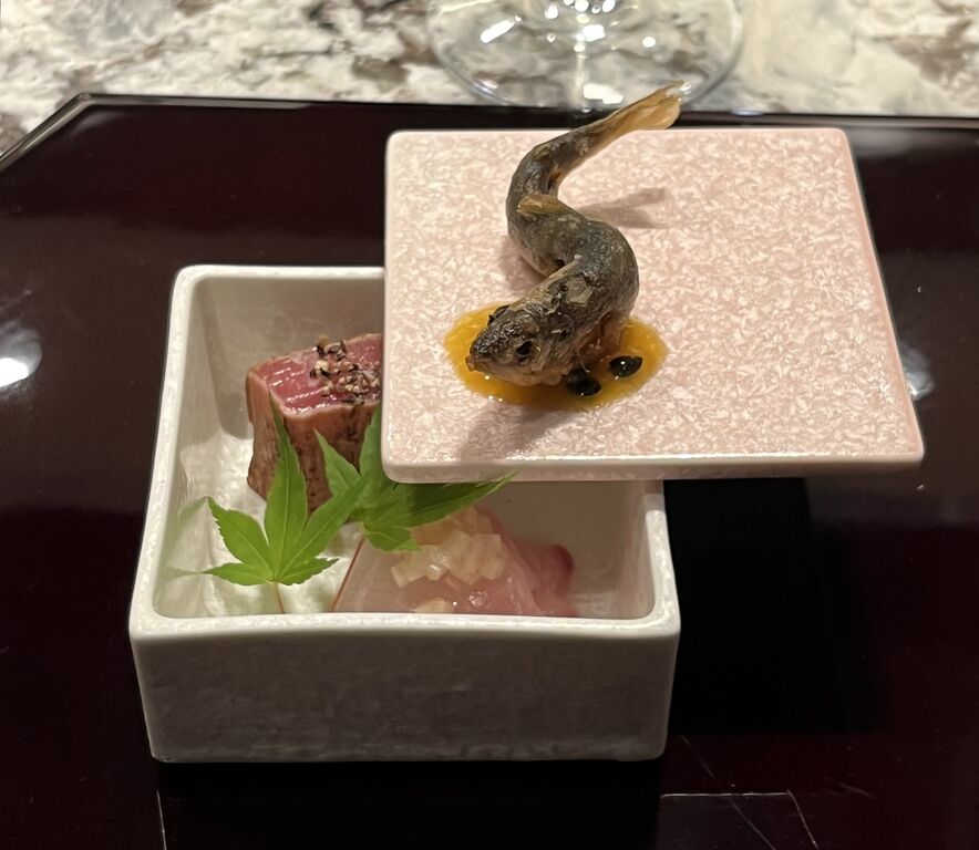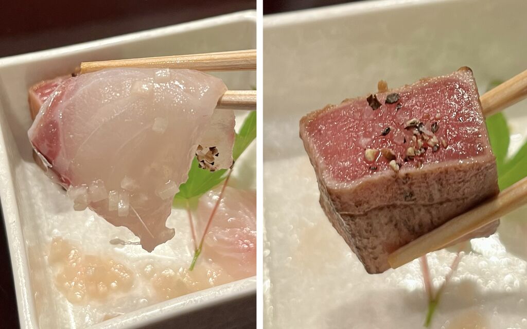 稚鮎の天婦羅 本鮪中トロ炙り 縞鯵のお造り