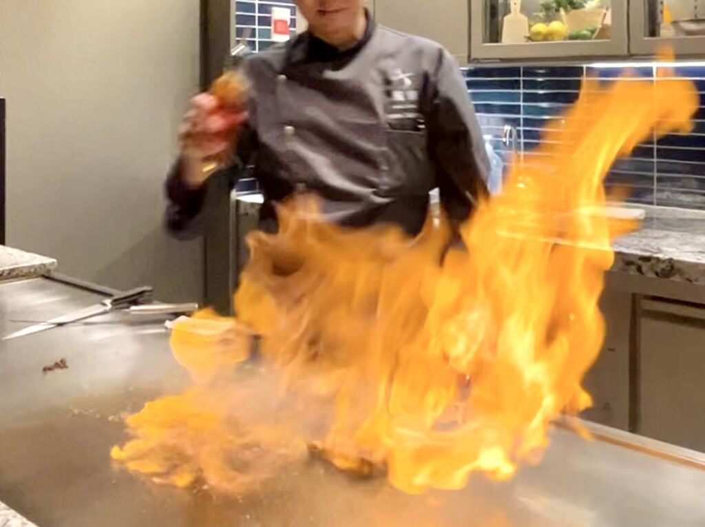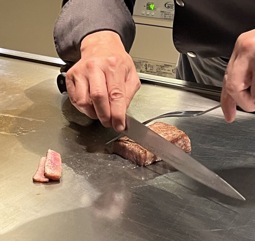 フランベして仕上げ、2通りのカットの仕方で切り分け。