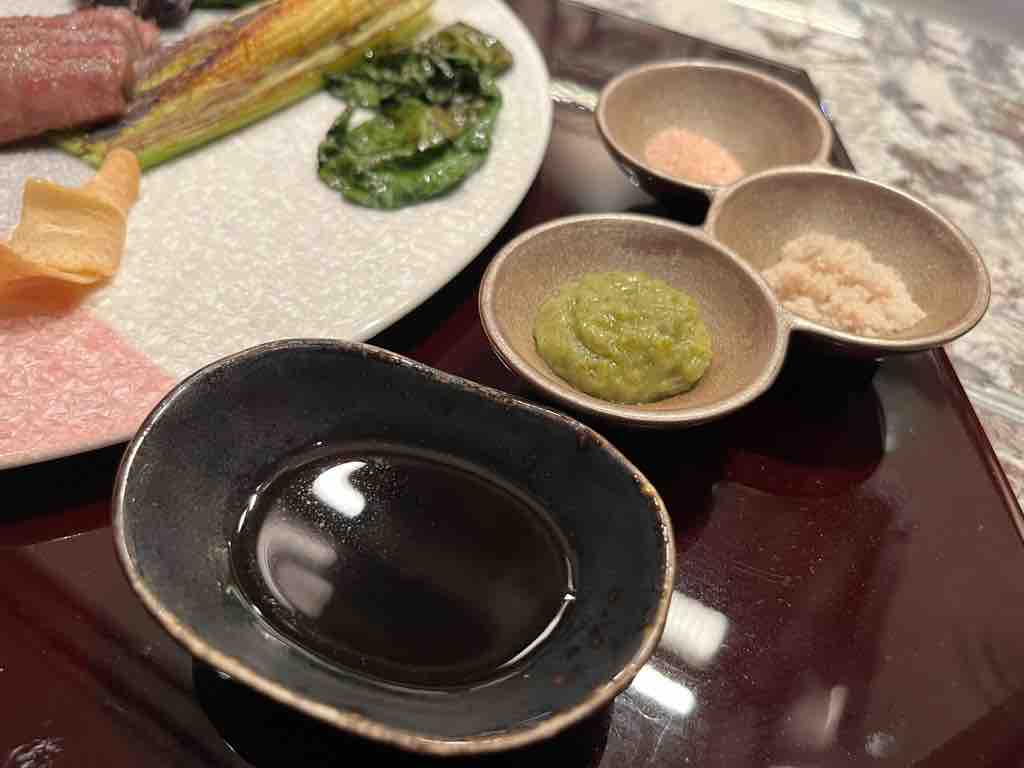 ポン酢、わさび、岩塩と藻塩。