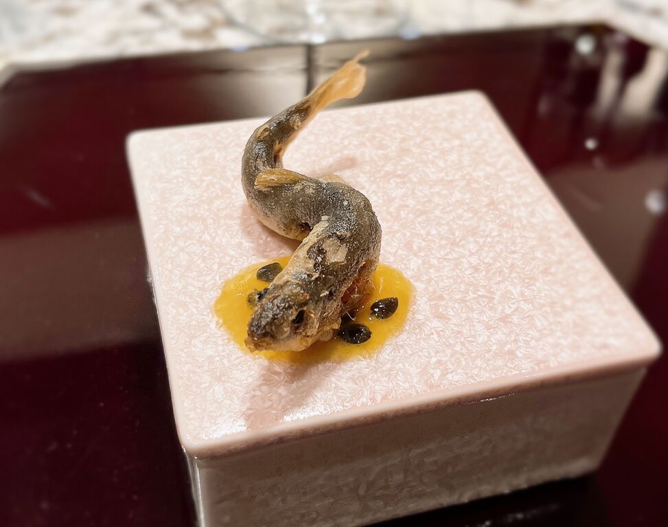 泳いでいる様に挙げられて、たで酢のかわりにパッションフルーツのソース。