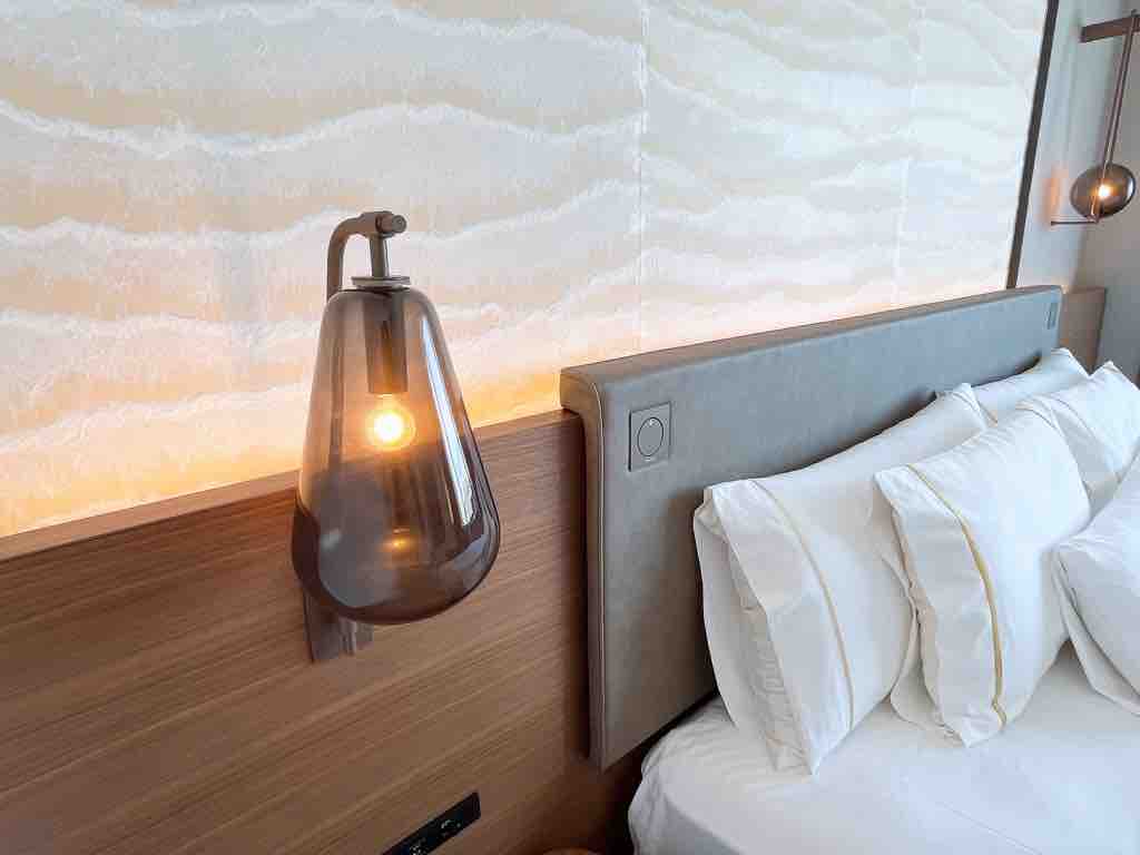 ベッド上の壁紙には職人の手すき和紙を使用し、川の流れを表現しているそうです。