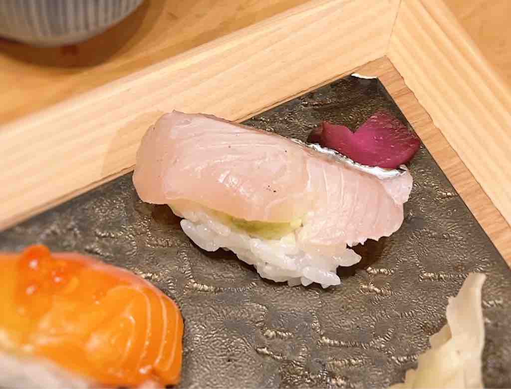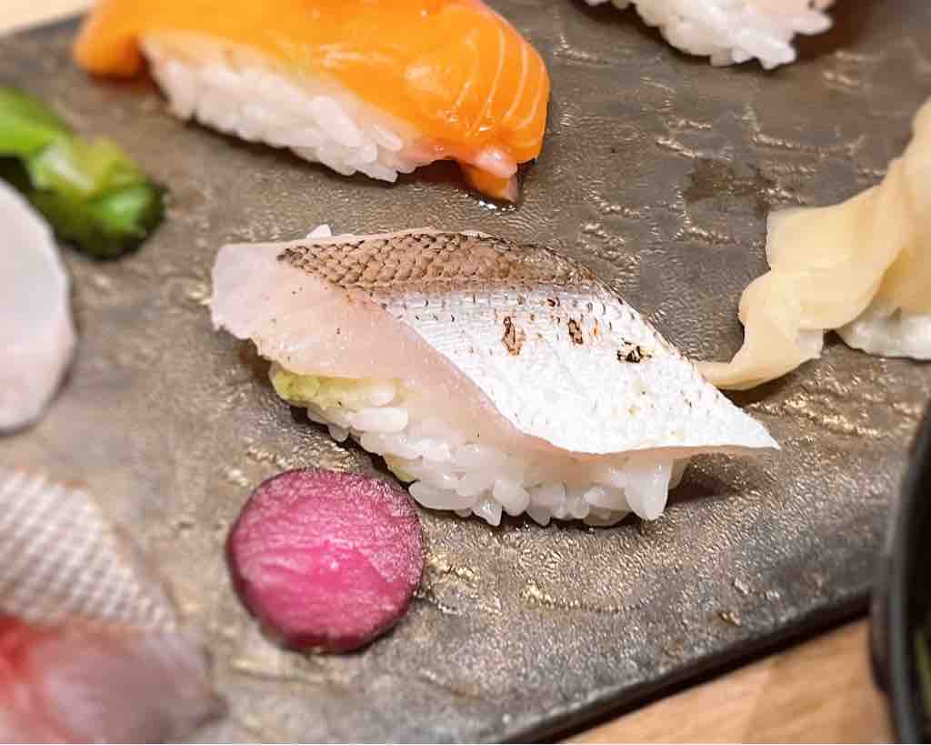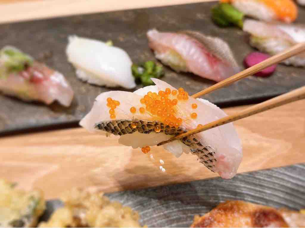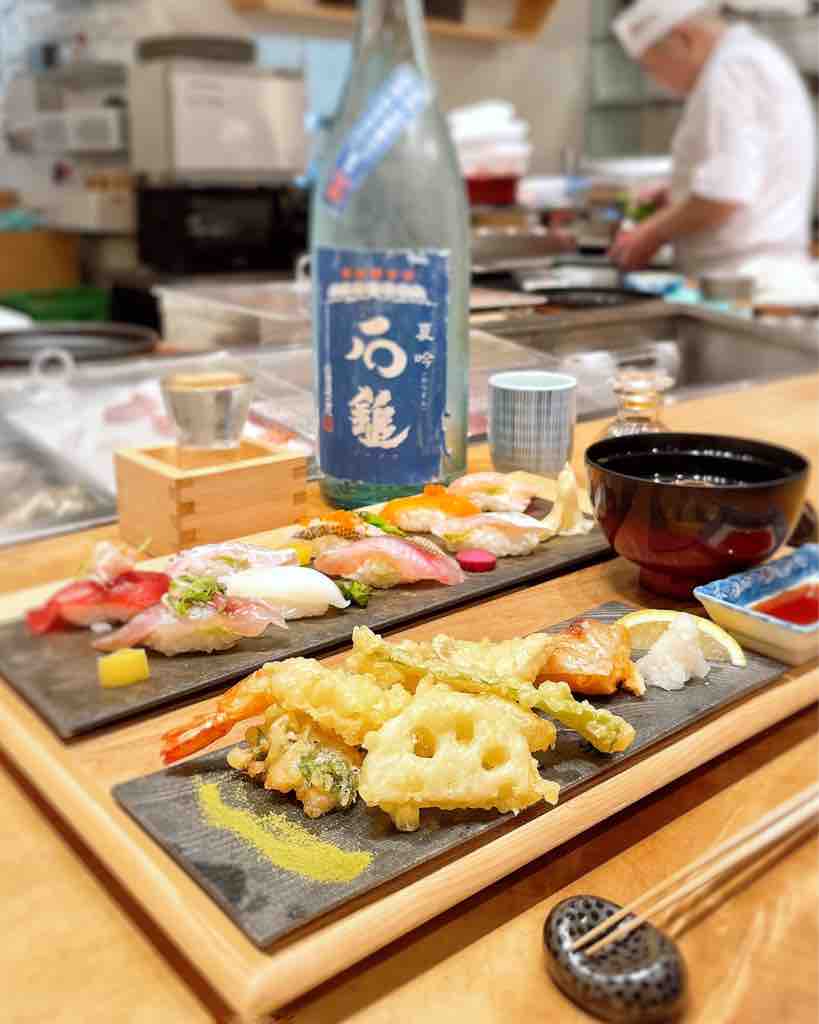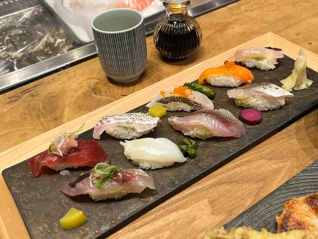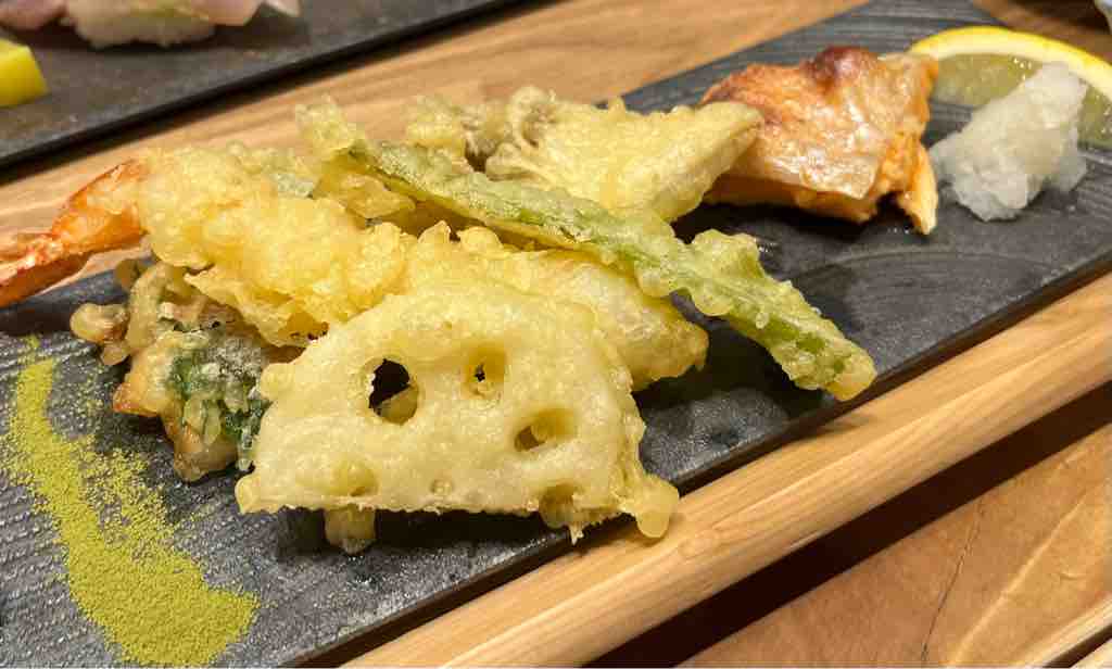 (握り寿司9貫、天ぷら5種類、本日の焼き魚、赤出汁)