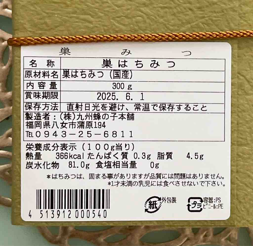 内容量:約300g原材料名:巣はちみつ採蜜地:九州賞味期限:製造日から2年間(ラベルに記載)製造者:九州蜂の子本舗 福岡県八女市蒲原194保存方法:直射日光を避け、常温にて保存してください。※1歳未満のお子様には、お与えにならないようにしてください。「九州蜂の子本舗」のヤフーショップ