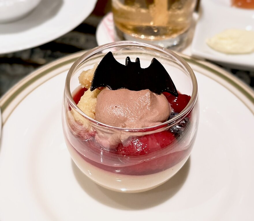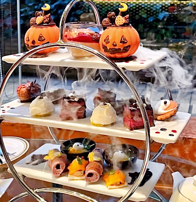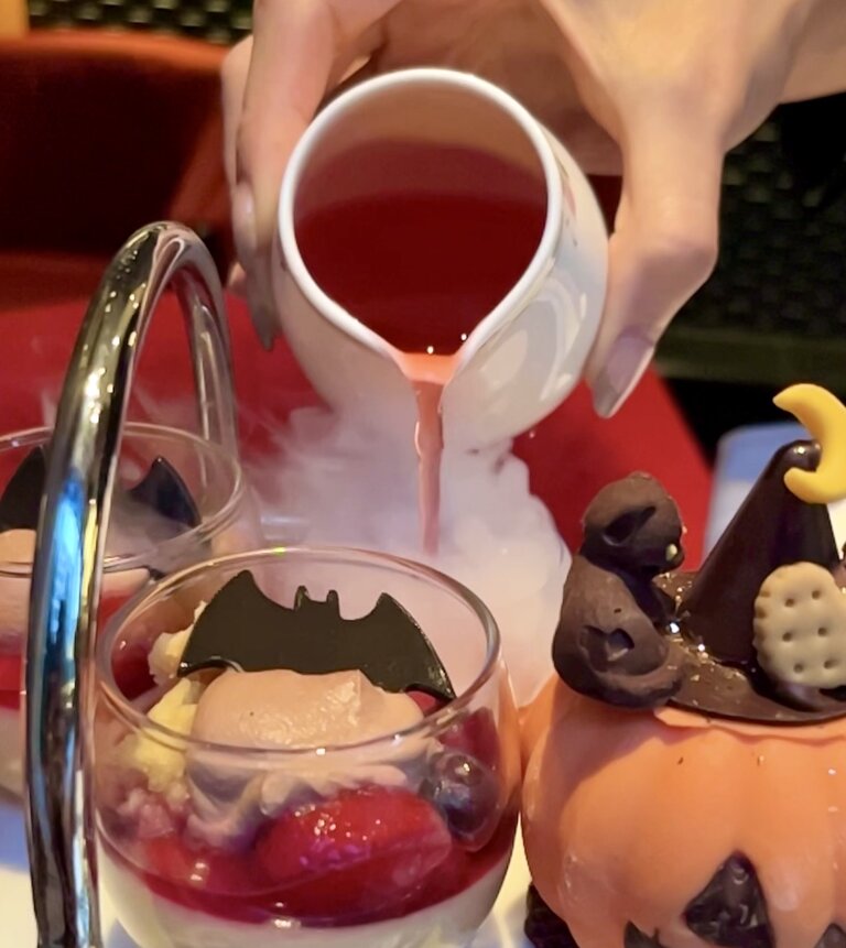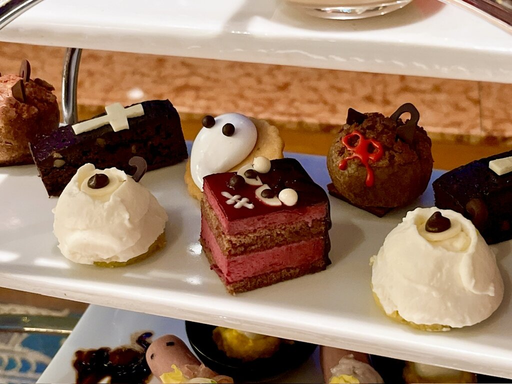 ・ミイラ男のクレームダンジュ ・フランケンシュタインのカシスムース ・黒猫のチョコレートシュークリーム ・棺桶のブラウニー ・おばけのバニラマシュマロ