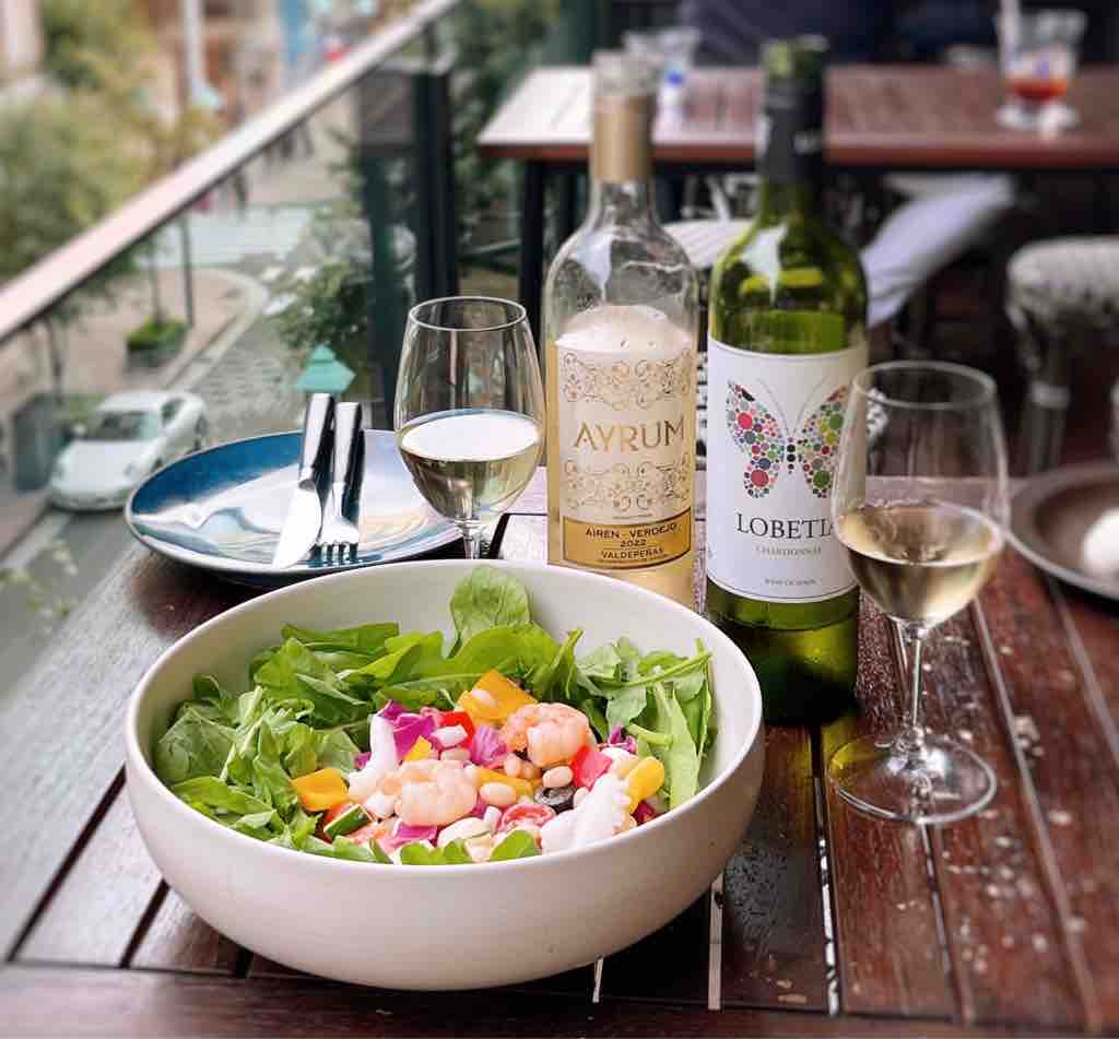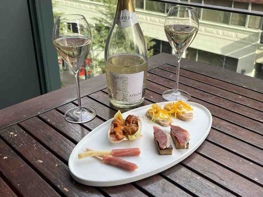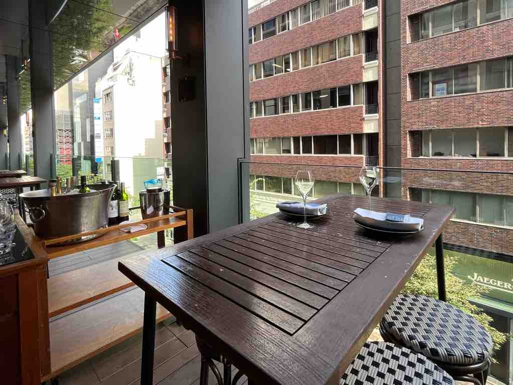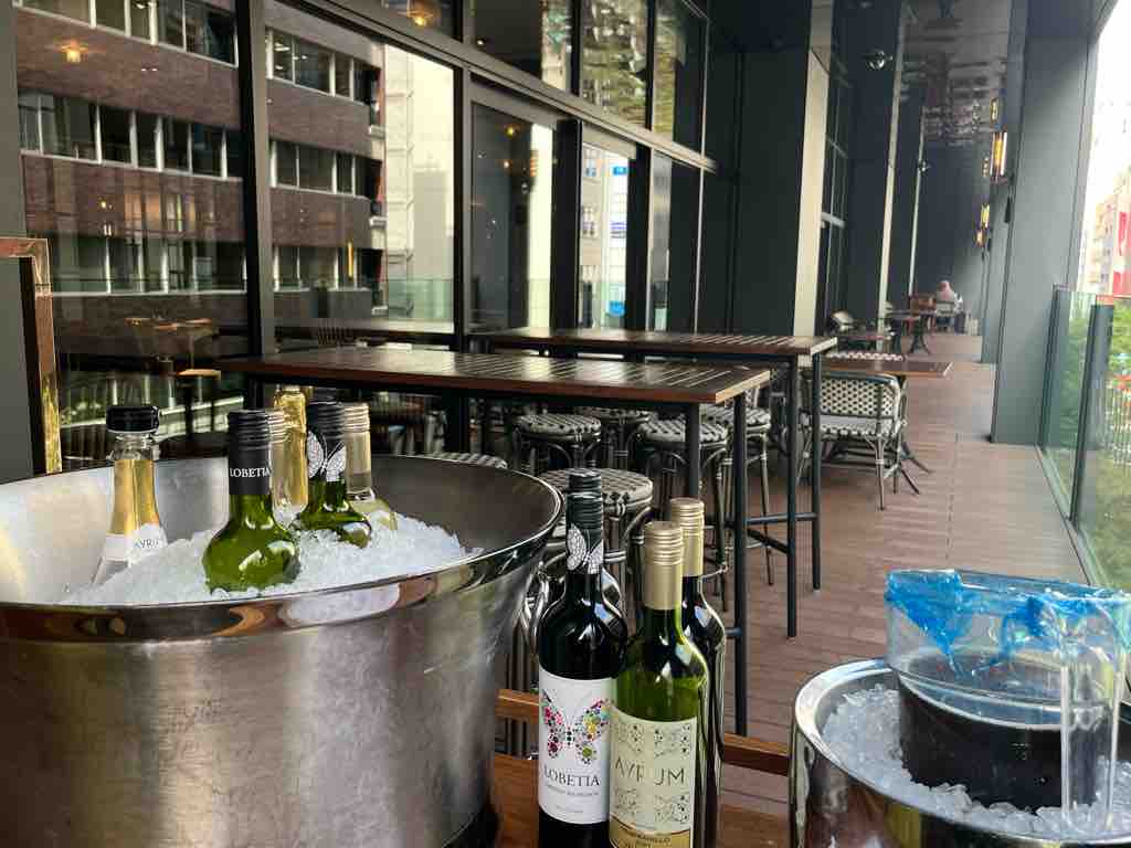 「銀座 バル・テラス」は、スペイン料理のコース(デザート以外はとりわけスタイル)と5種のワインの90分フリーフロー付きプラン(ラストオーダー60分)です。