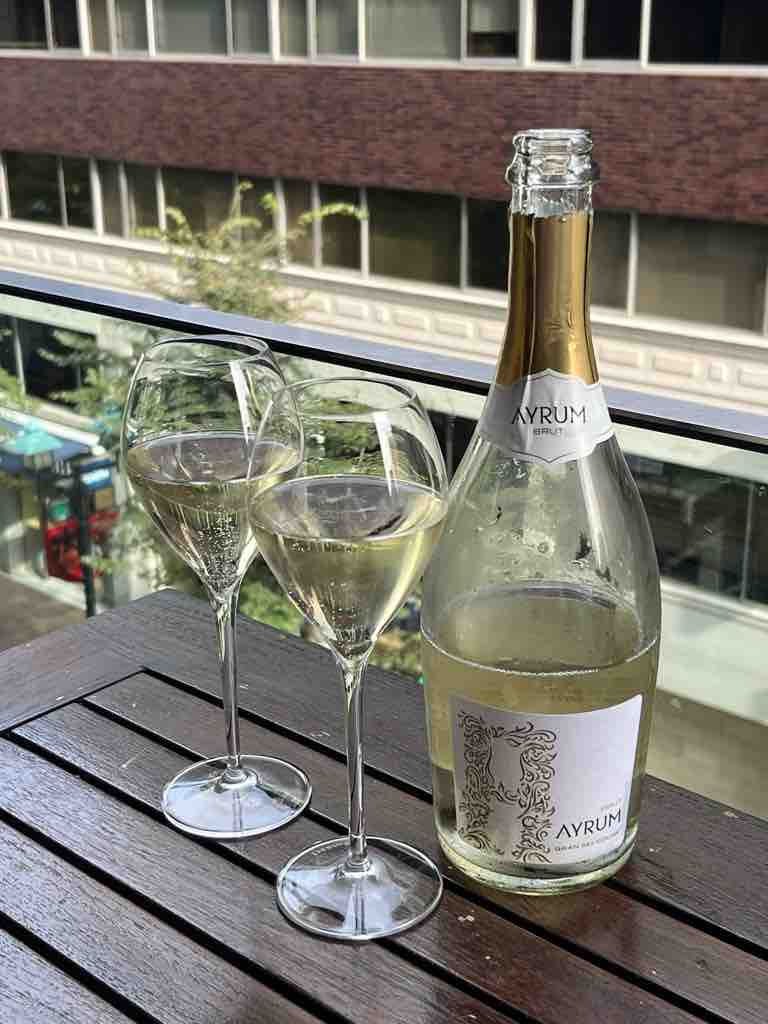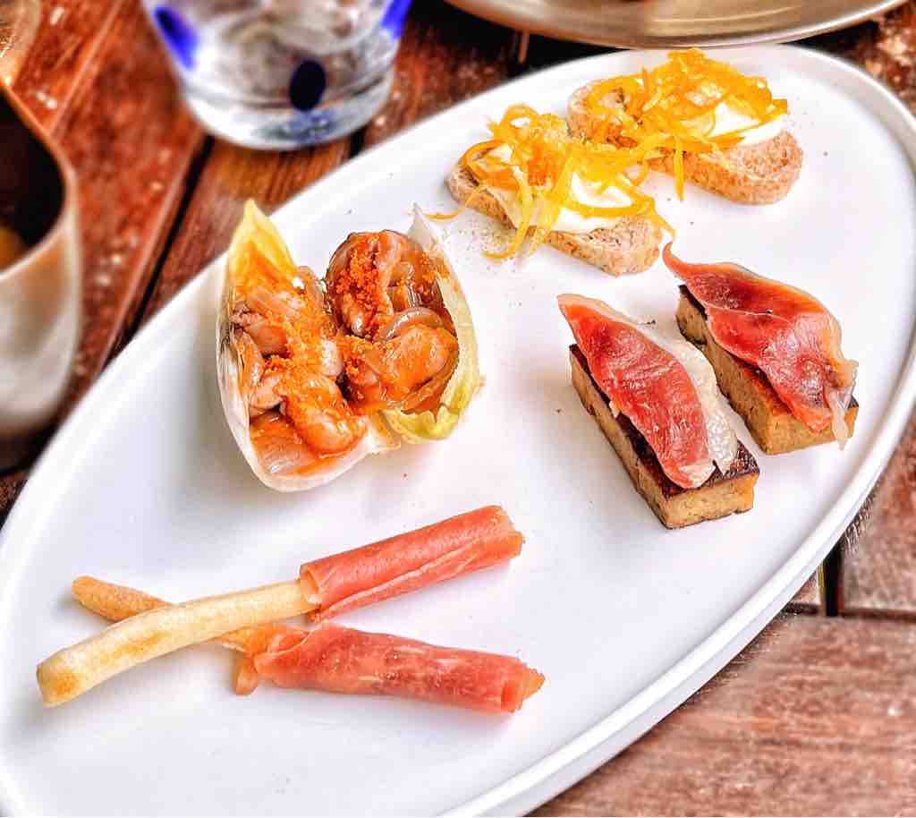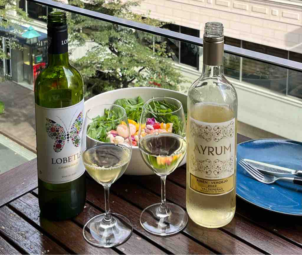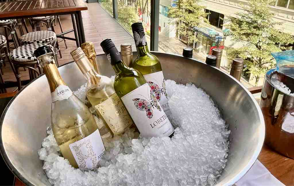 「銀座 バル・テラス」は、スペイン料理のコース(デザート以外はとりわけスタイル)と5種のワインの90分フリーフロー付きプラン(ラストオーダー60分)です。