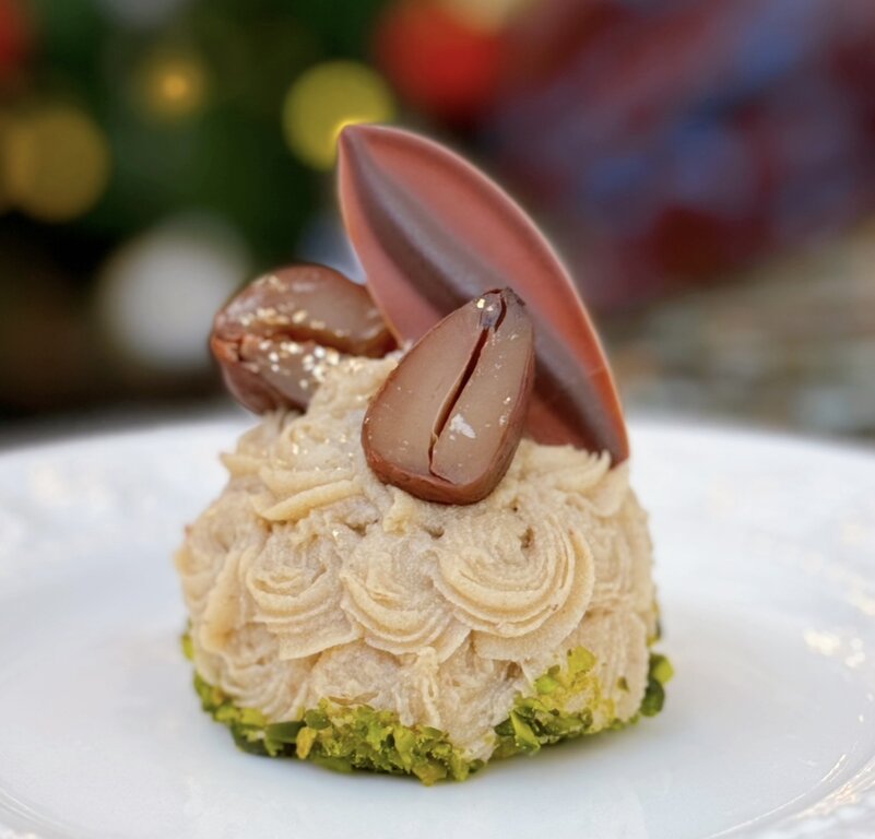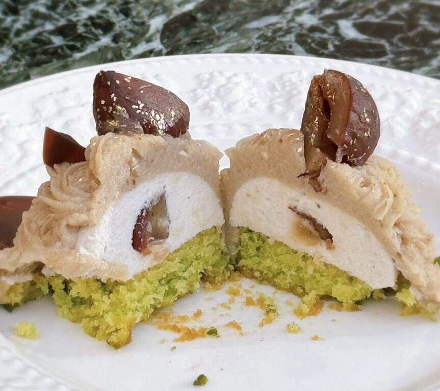 ピスタチオのダマンド生地で、栗たっぷりのマロンケーキな味わい。