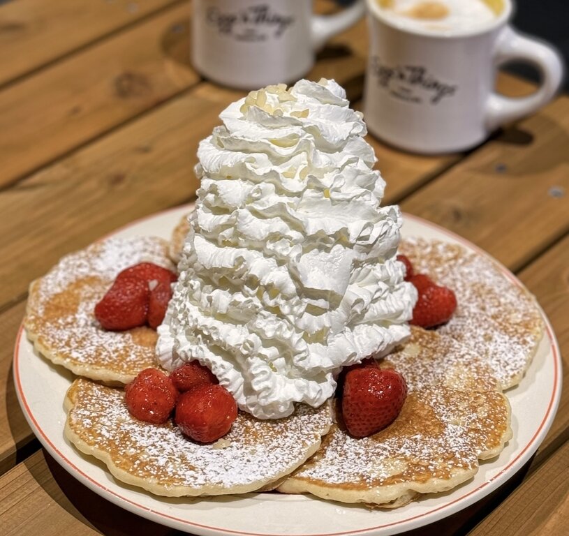 小型で薄くてもちっとした生地のパンケーキを並べて、もりもりっとホイップクリーム、フローズンの甘酸っぱい海外ストロベリーと粉糖。