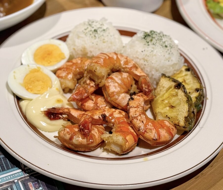 ニンニク風味の殻付きエビの背中に切れ目が入っているので食べやすい。ライス、ゆでたまご、焼パイン添え。