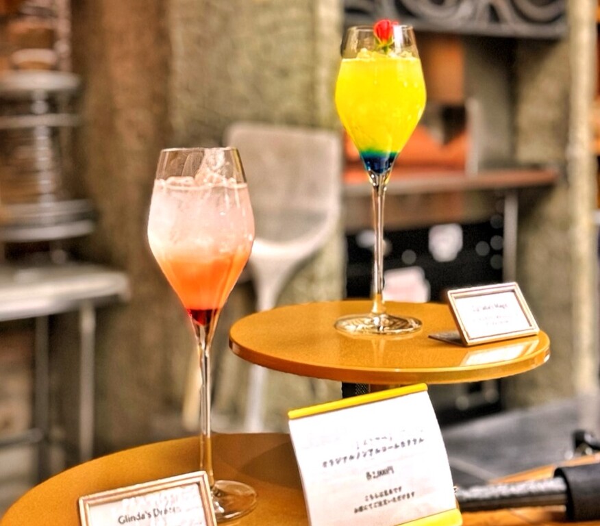 『ウィキッド』の世界に思いを馳せ、主人公たちのドレスの色やキャラクターをイメージした2種のノンアルコールカクテルがオプションでお席にて注文できます。