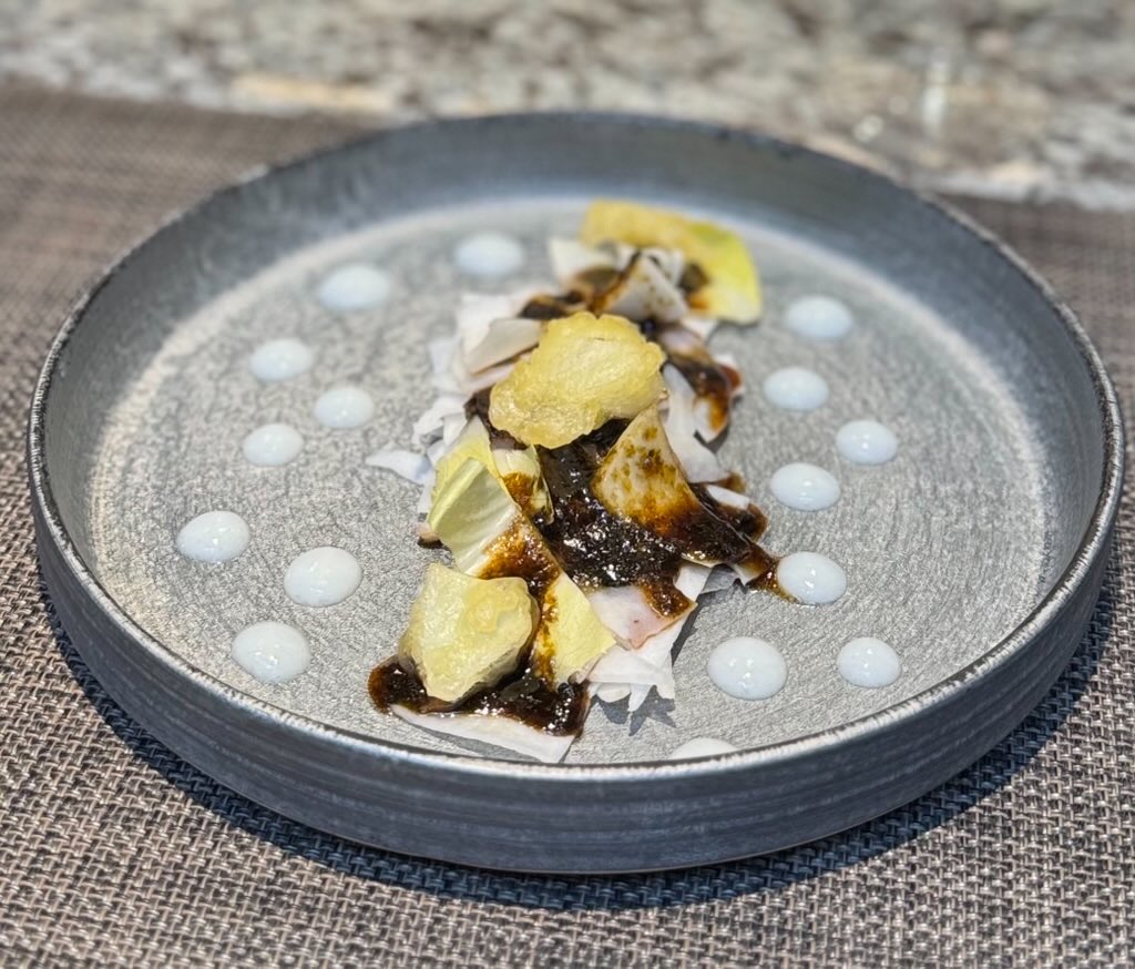 雪のイメージでデコレーションされた白い野菜のサラダです。サクッと揚がったユリ根の天ぷらがアクセント。海苔のドレッシングでいただき、そのおいしさに感動。