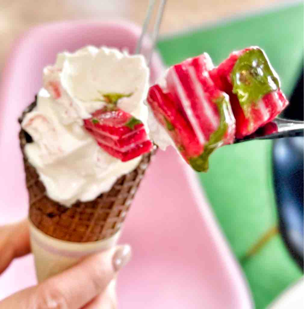 さらにわさびを模した抹茶のムースを絶妙にトッピングしてあり、味わいはミルキーなソフトクリームとマッチ!