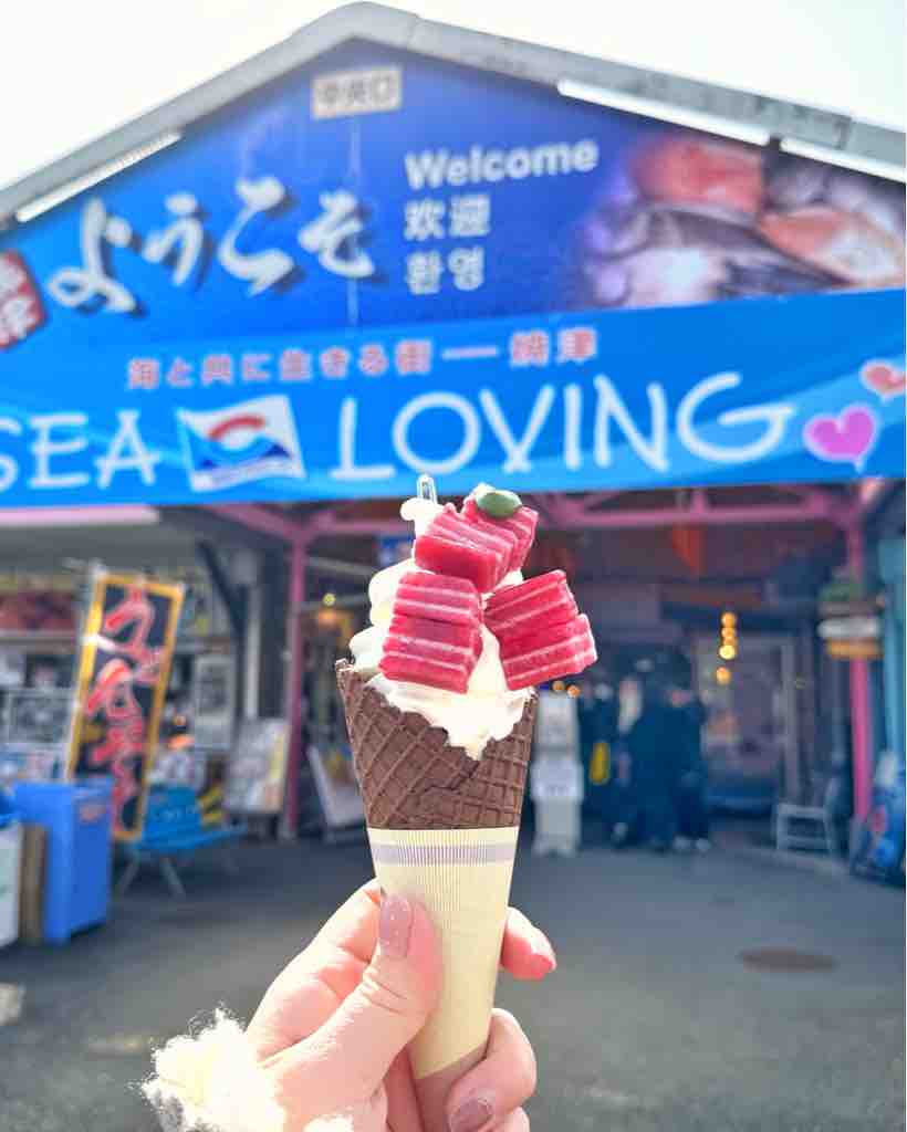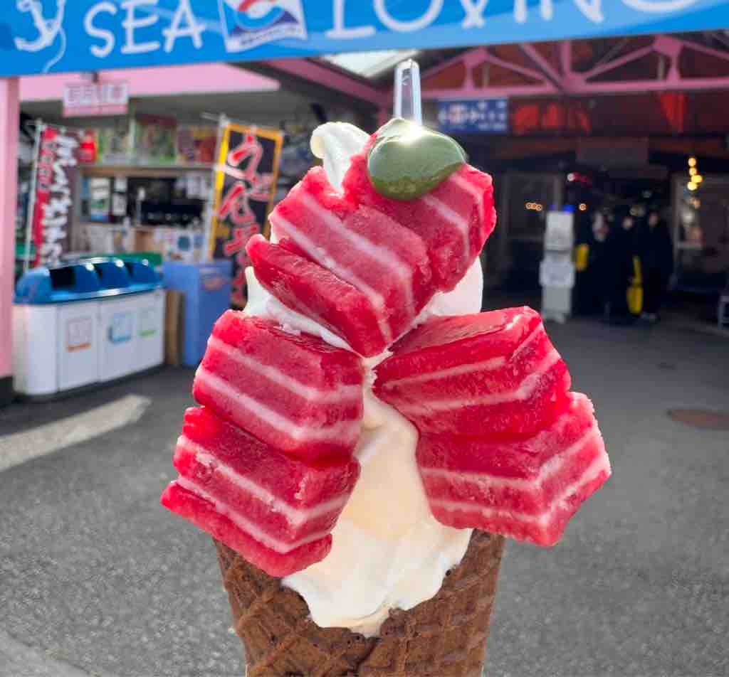 まぐろソフトは、実際まぐろが載っているのではなく、まぐろに似せたラズベリーのシャーベット。ちょっと溶けかけると解凍マグロのようでほんとにリアル。