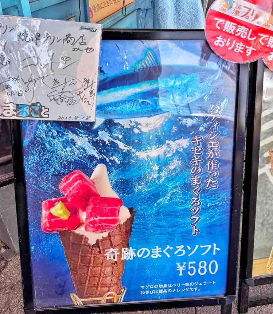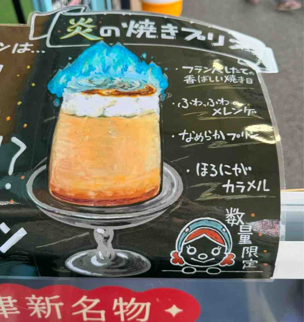 焼津さかなセンターの入り口で目立っていた焼きプリン専門店で、ブランデーをかけて炎の演出をする「炎の焼きプリン」と、看板を見て気になった新作の「究極のまぐろソフト」をイートイン。
