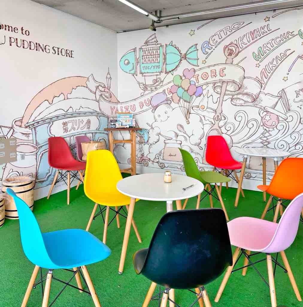 併設のカフェで、フォトスポットも用意してあり、カラフルな椅子とゆったりとしたテーブルで休息がてら楽しめました。