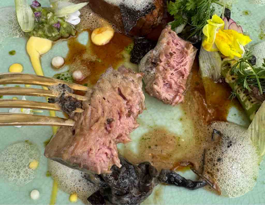 「ジュスキュイ」という通り仔牛肉は完璧な火入れで、柔らかくジューシー。トリュフの芳醇な香りと、モリーユ茸、トランペット茸の食感が楽しめました。