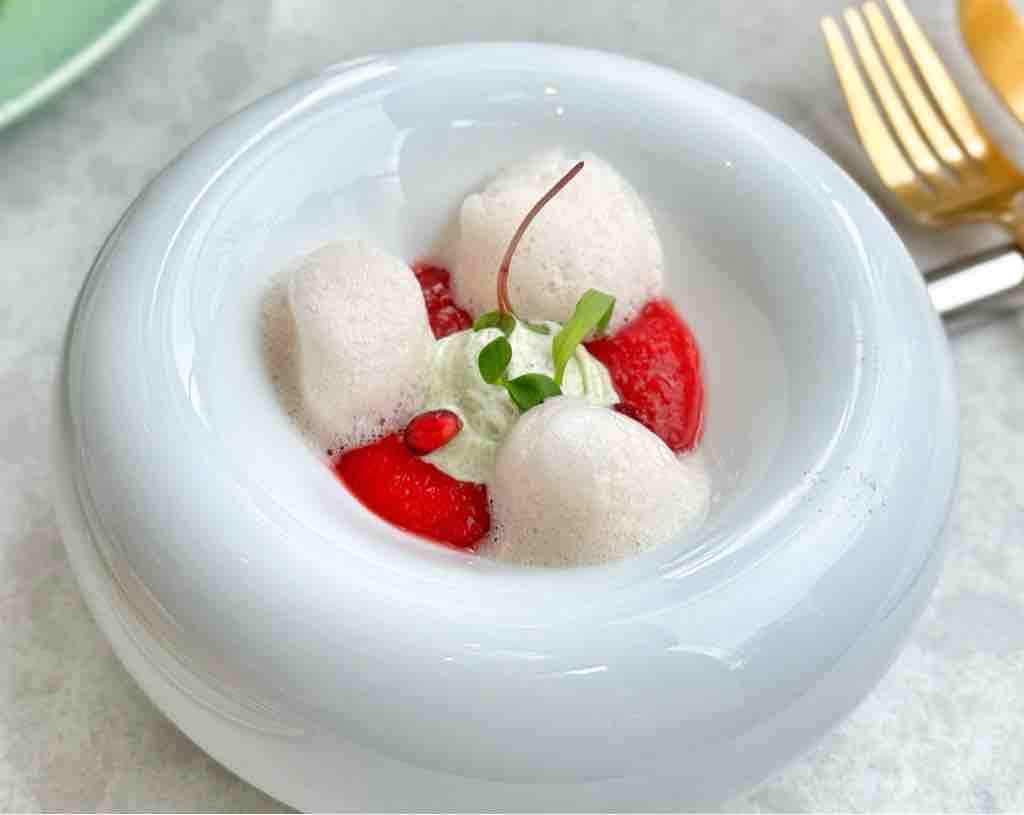 フランボワーズのビシソワーズにクレソンとフロマージュブラン、ザクロの泡が添えられ、爽やかな酸味が食欲をそそります。