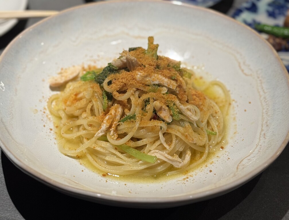ピリ辛オイルがしっかり乳化されていて、からすみの旨みが全体に広がります。